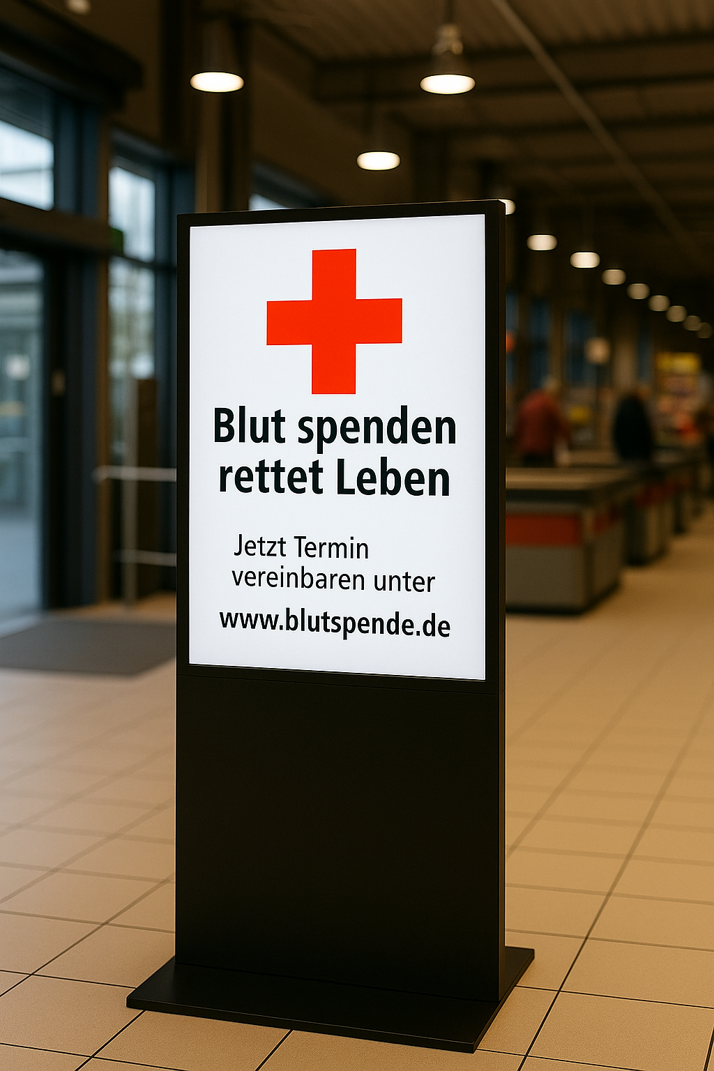 Unsere Displays sind in verschiedenen Größen erhältlich – je nach Standort und Platzverhältnissen. In der Regel verwenden wir Wand- oder Standdisplays mit Bildschirmdiagonalen zwischen 32 und 50 Zoll. Alle Geräte verfügen über Full-HD- oder 4K-Auflösung, eine hohe Helligkeit und sind für den dauerhaften 24/7-Betrieb ausgelegt.